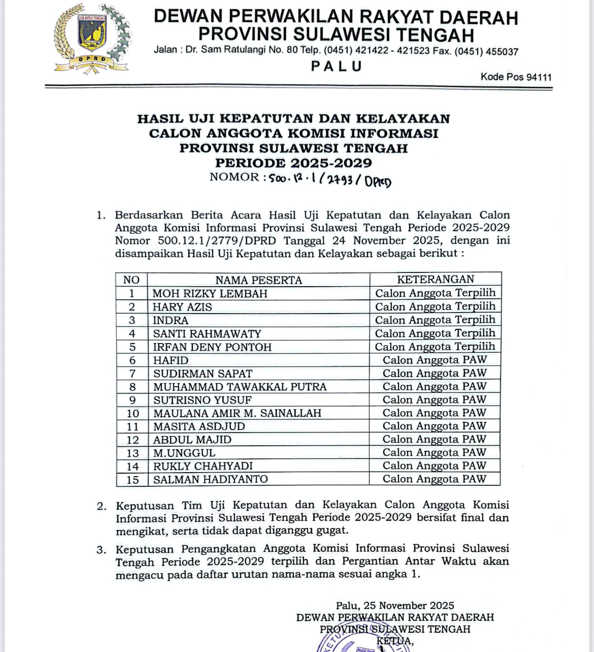 DPRD menegaskan bahwa keputusan tim Uji Kepatutan dan Kelayakan bersifat final dan mengikat. Adapun proses pengangkatan anggota Komisi Informasi Sulteng periode 2025–2029, termasuk mekanisme PAW, akan mengacu pada urutan nama yang telah ditetapkan. (kn)