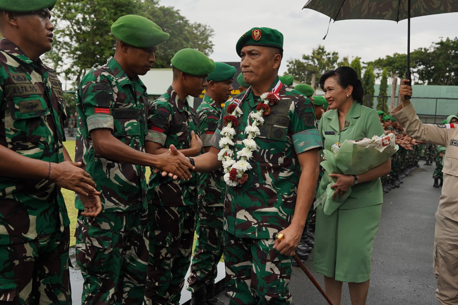 KAUSA.ID, PALU – Palu Pangdam XXIII/Palaka Wira, Mayjen TNI Jonathan Binsar Parluhutan Sianipar, bersama Ketua Persit Kartika Chandra Kirana Daerah XXIII/Palaka Wira, Ny. Dewi Binsar Sianipar, tiba di Markas Kodam XXIII/Palaka Wira, Jalan Jenderal Sudirman, Palu, Senin (1/9/2025).