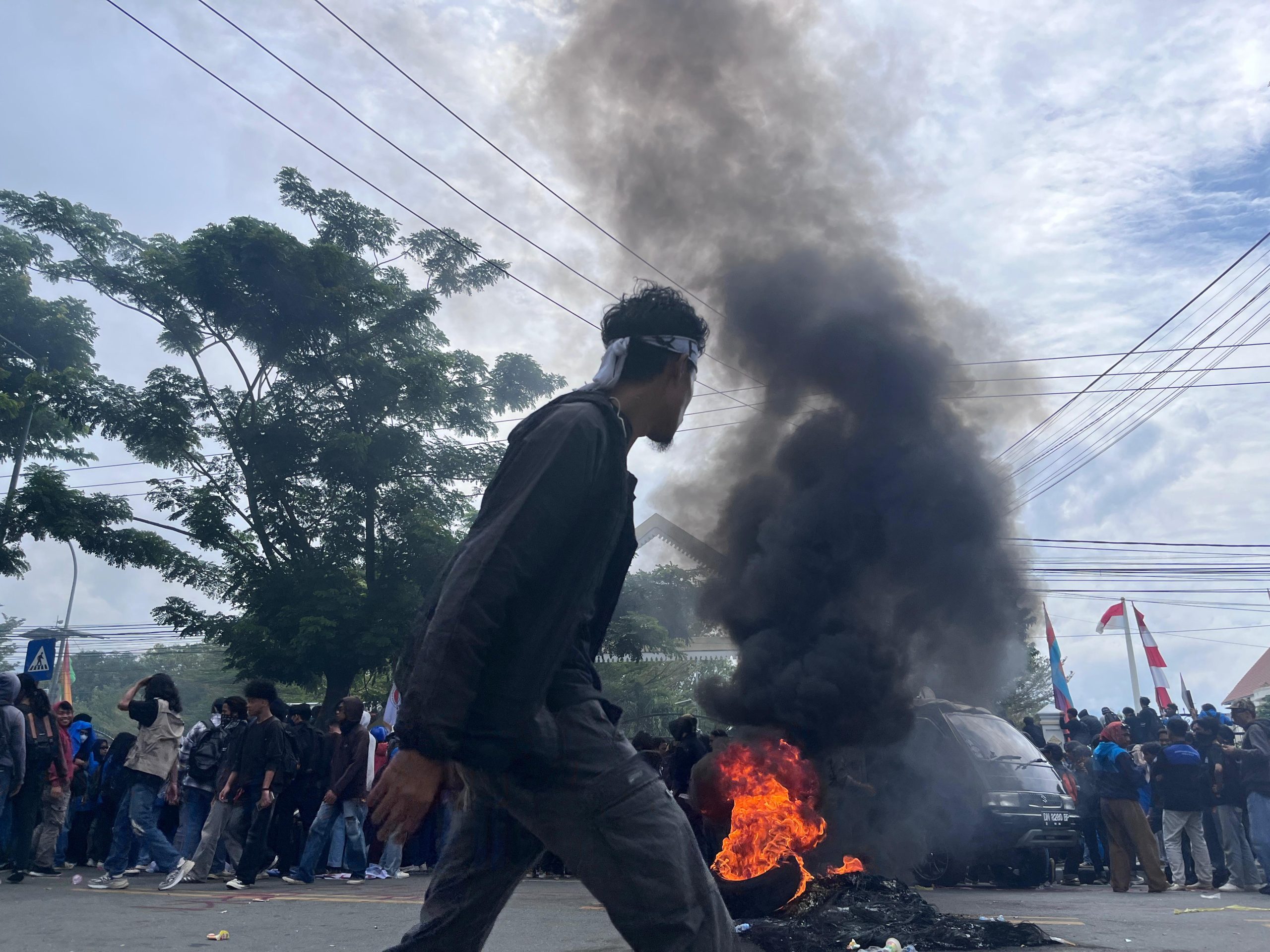 Massa aksi tiba sekitar pukul 09.00 Wita dengan membawa spanduk, poster yang berisi tuntutan serta bendera ‘one piece’ sebagai bentuk protes terhadap kebijakan pemerintah.